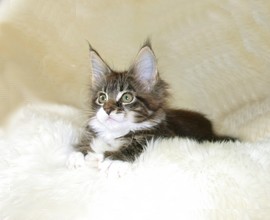tacoma ist die letzte tochter unserer schönen nevada. sie ist temperamentvoll und anhänglich. ihre schnauze ist lang von guter breite und tiefe, das kinn ist kräftig. das profil ist ausgezeichnet. die ohren sind super gesetzt und bepinselt. sie hat einen langen und schlanken körper auf hohen beinen der mit einem langen schwanz endet. die fellqualität hat sie von der mutter vererbt bekommen, es ist lang und seidig. das classic tabby ist ausgezeichnet, die weiss verteilung sehr gut.